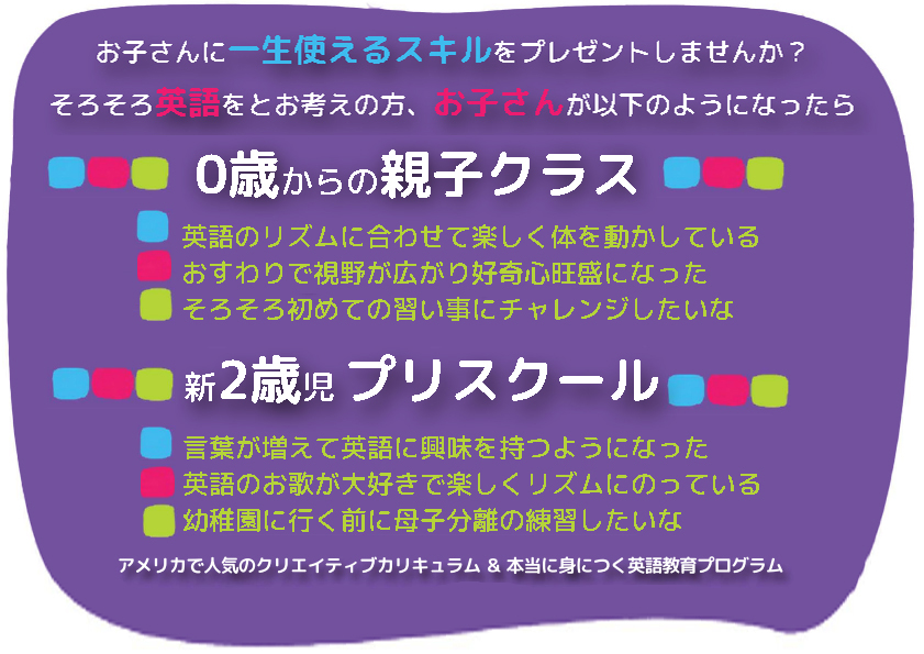 親子で参加できるクラス、未就園児のインターナショナルプリスクール、幼稚園や小中学校から帰宅後の午後クラス、アフタースクールを卒業したら併設の英語教室へステップアップできます。パパママ対象の社会人向けクラスまで幅広い年齢、ニーズに対応したクラスを開講しています。