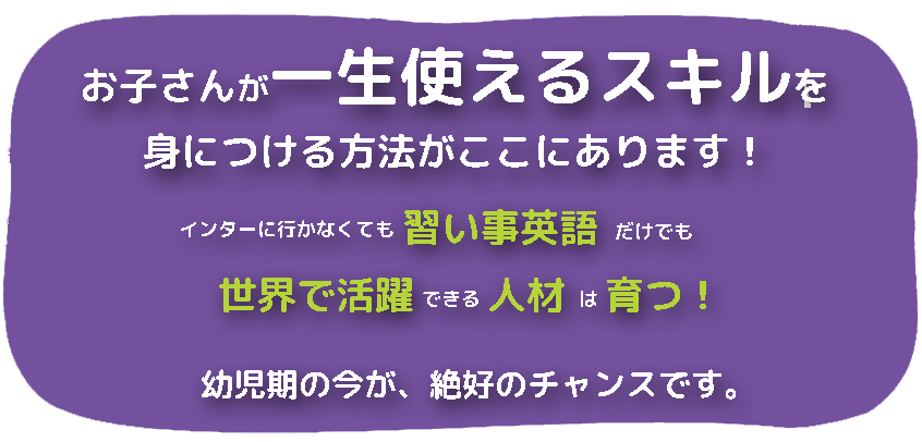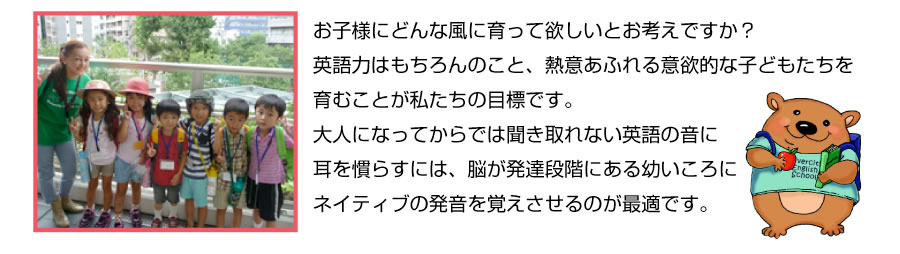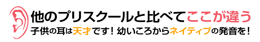 耳のいい幼児期からスクールオリジナル教材を取り入れた、独自の練習方法により、積極的な発話をうながし、正しい発音の方法を学ぶことにより確実な英語力を身につけます。