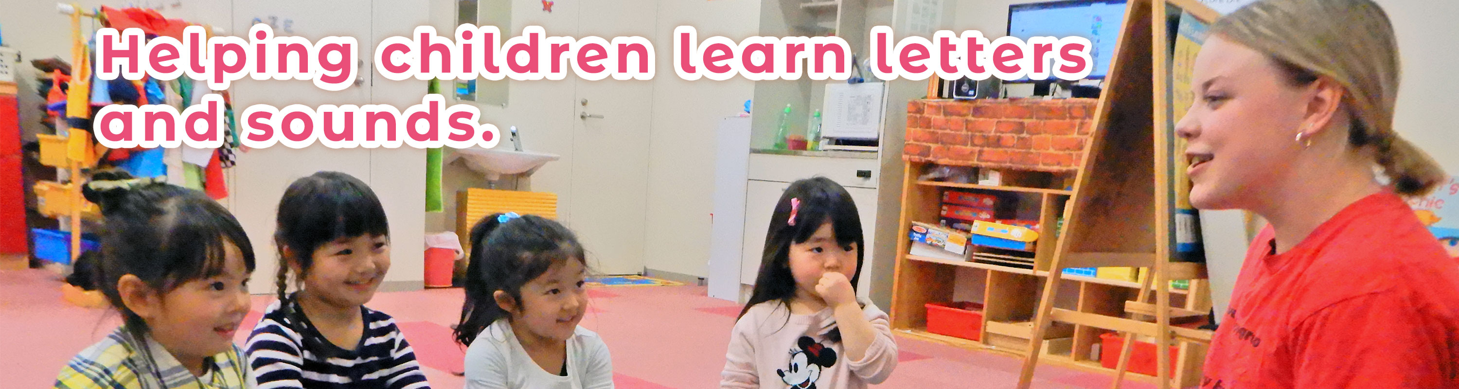 Regarding English acquisition, we set the goal to be able to read English on your own and to say your own thoughtsin English with a nice pronunciation. We teach English letter sounds in every class before children’s brain is tuned in the Japanese or other native sounds.We help children learn the sounds of the letters, blending the sounds into words, and putting the words into a sentence using a synthetic phonicsapproach from a young age.